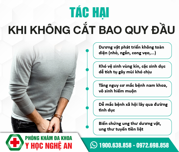 Bao quy đầu không tuột xuống khiến cho chất cặn và bựa sinh dục tích tụ lâu gây viêm nhiễm sinh dục nam. Tạo điều kiện cho vi khuẩn tấn công sâu hơn làm tăng nguy cơ gây ung thư dương vật.