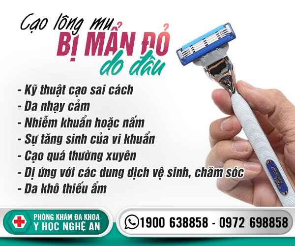 Bạn cạo lông mu bị mẩn đỏ, bạn nghi ngờ bị viêm nang lông, viêm nhiễm thì có thể đến Phòng khám đa khoa y học Nghệ An để khám chữa bệnh. Nơi đây đã được Sở y tế tỉnh Nghệ An cấp phép và giám sát mọi hoạt động, trong đó có điều trị các bệnh lý nam khoa, phụ khoa.