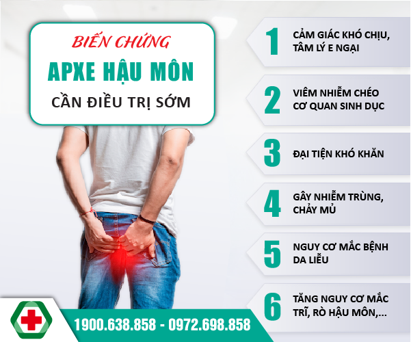 -Tăng nguy cơ bị rò hậu môn: bệnh apxe hậu môn kéo dài sẽ biến chứng thành bệnh rò hậu môn. Ban đầu người bệnh chỉ thấy hậu môn có những cục sưng cứng. Dần dần những ổ apxe sẽ tăng lên về kích thước gây vỡ miệng và chảy mủ. Nếu tình trạng này lặp đi lặp lại nhiều lần sẽ hình thành nên các đường rò hậu môn.
