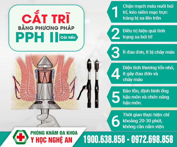 Cắt trĩ bằng phương pháp PPH hay còn được gọi là kỹ thuật thắt vùng niêm mạc búi trĩ. Với phương pháp này, bác sĩ sử dụng dụng cụ như kẹp ghim để xác định vị trí búi trĩ, sau đó cắt bỏ vòng đai niêm mạc trực tràng, khôi phục vị trí các tổ chức trĩ bị sa xuống. Tiến hành mở rộng ống hậu môn, thắt nút mạch máu cung cấp máu nuôi búi trĩ. Sau đó loại bỏ búi trĩ đồng thời tạo hình hậu môn phía ngoài.