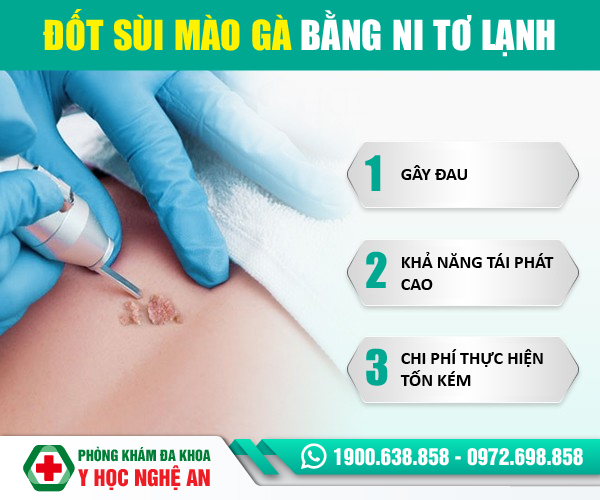 Đây là phương pháp mà bác sĩ chuyên khoa sẽ sử dụng khí Nitơ dạng lỏng hoặc Cacbondioxit đông lạnh áp lên các nốt u nhú, mụn sùi mào gà, nhằm gây ra những vết rộp tại vùng da chứa u nhú, mụn sùi và các vùng da xung quanh nốt mụn sùi, sau đó các nốt u nhú, mụn sùi mào gà sẽ bị bong ra theo các phần da bị rộp. Quá trình chữa trị bệnh sùi mào gà bằng phương pháp áp lạnh này diễn ra ngắn chỉ mất khoảng từ 10 – 15 phút là hoàn thành, hiệu quả điều trị khá cao, tuy nhiên phương pháp này vẫn còn tồn tại 1 số nhược điểm: Quá trình điều trị phải thực hiện nhiều lần, trong quá trình điều trị có khả năng gây ra tình trạng chảy máu, người bệnh có thể chịu đau, phương pháp này còn khiến có vùng da lành xung quanh nốt mụn sùi mào gà cũng bị sưng rộp theo và sau điều trị khả năng cao sẽ để lại sẹo cho người bệnh.